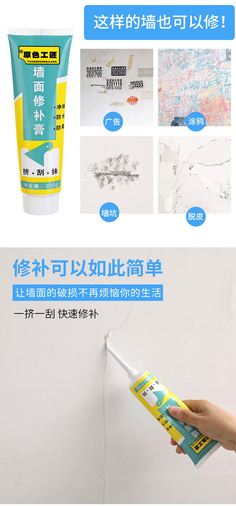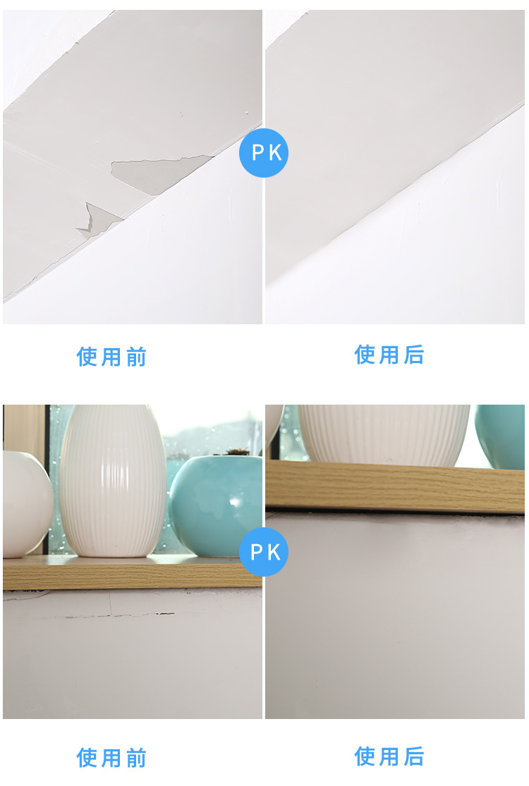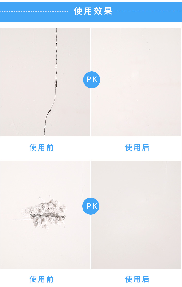 适用: 墙壁起泡、脱落、裂开、钉眼洞孔、涂鸦小广告、墙面划痕